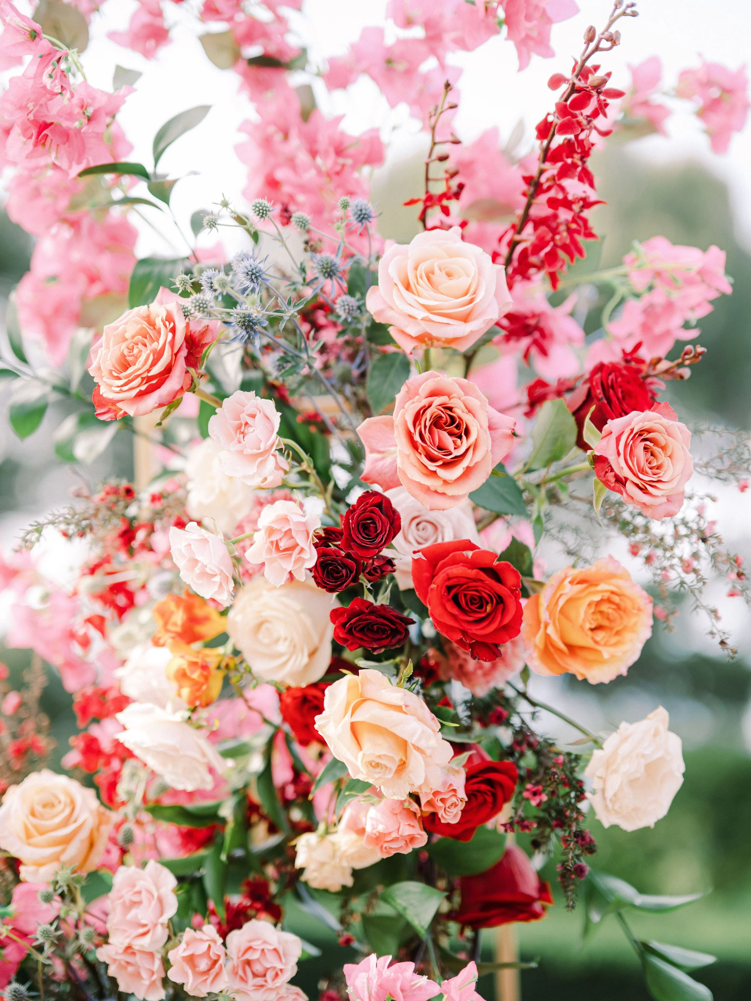 Set along the serene coastal landscape, the florals brought energy and movement to the scene. Asymmetric textures, layered blooms, and bold tonal contrasts formed a visual language that felt both artistic and celebratory. The goal was to blend cultural elements not through literal motifs, but through color stories that echo emotion, heritage, and connection.