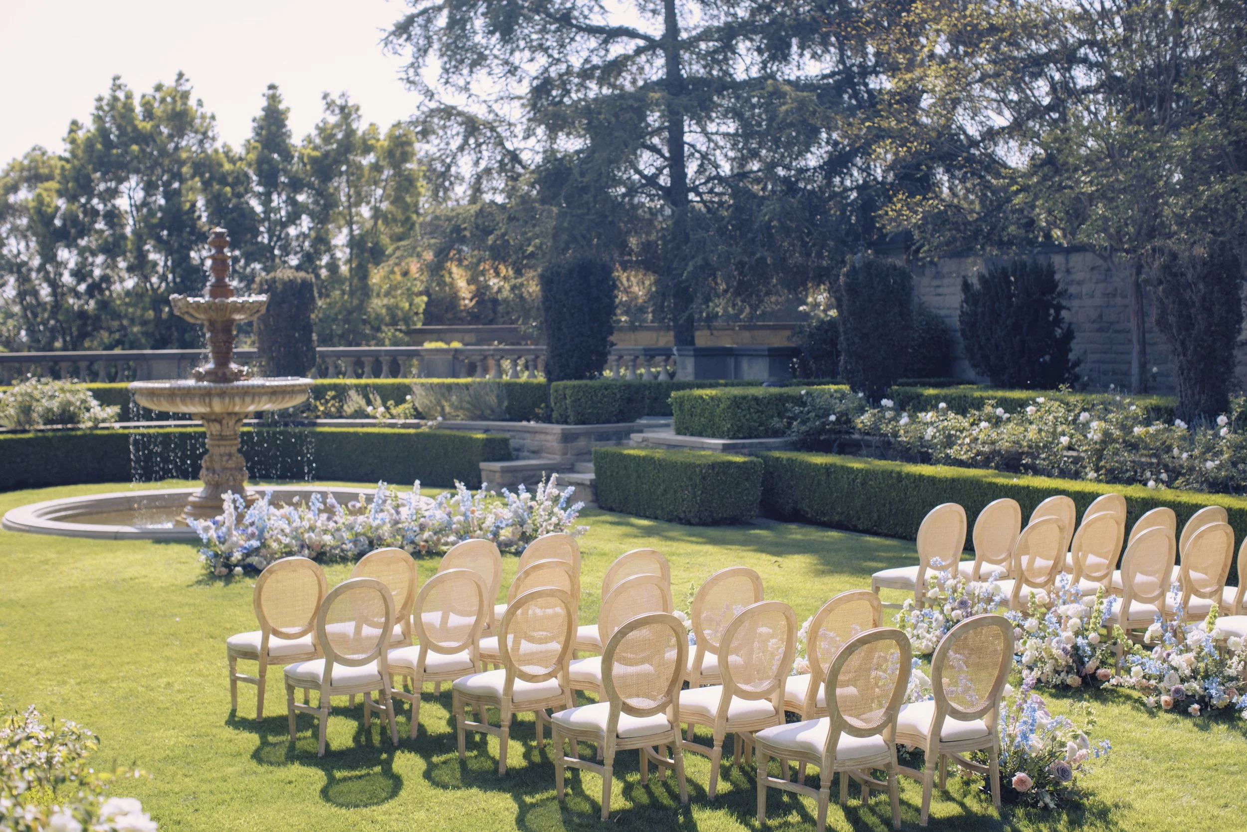 Instead of a traditional arch, the ceremony space was designed with a sweeping floral meadow that wrapped gently around the fountain, creating a natural frame that felt airy, elegant, and modern.