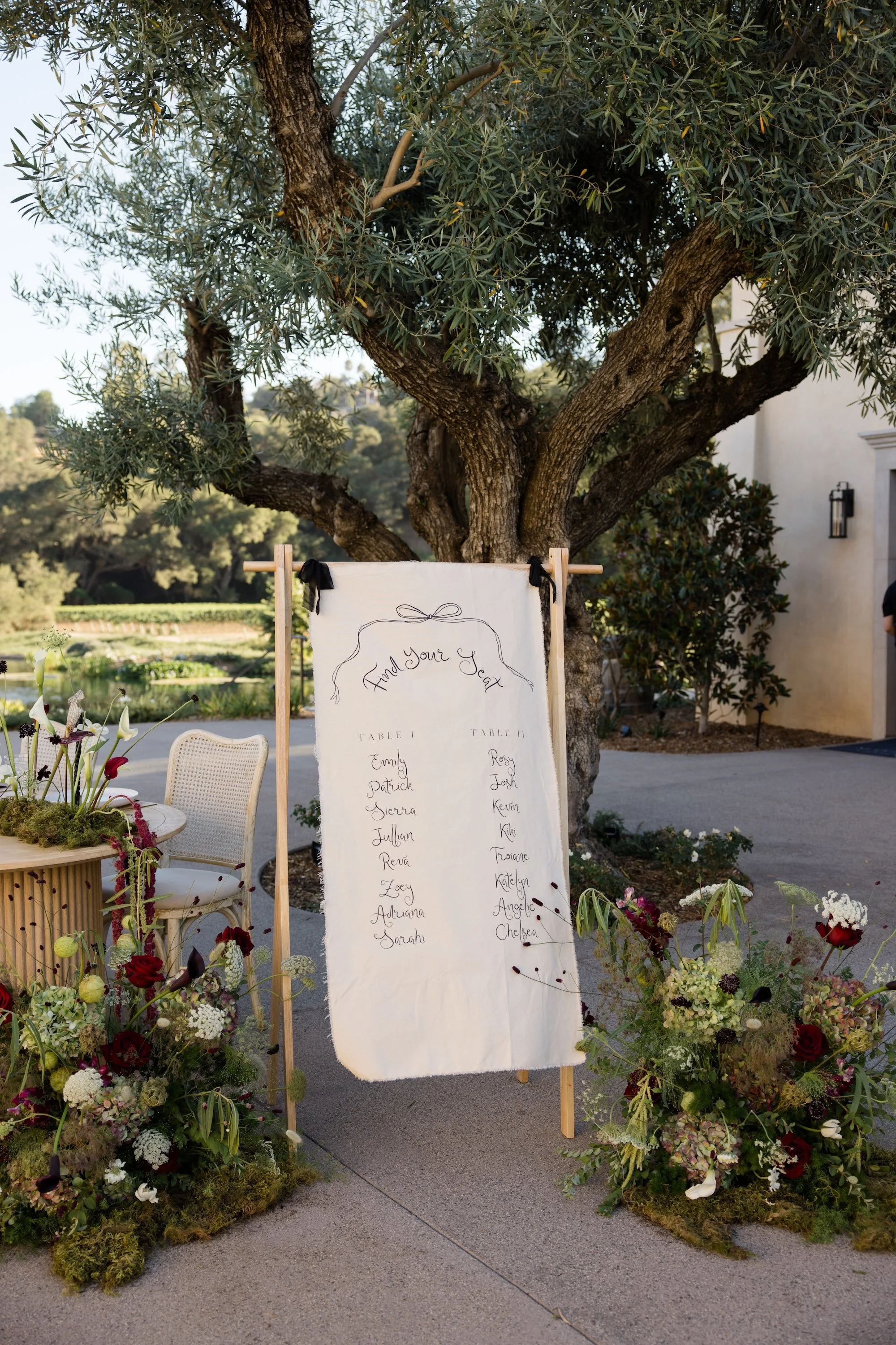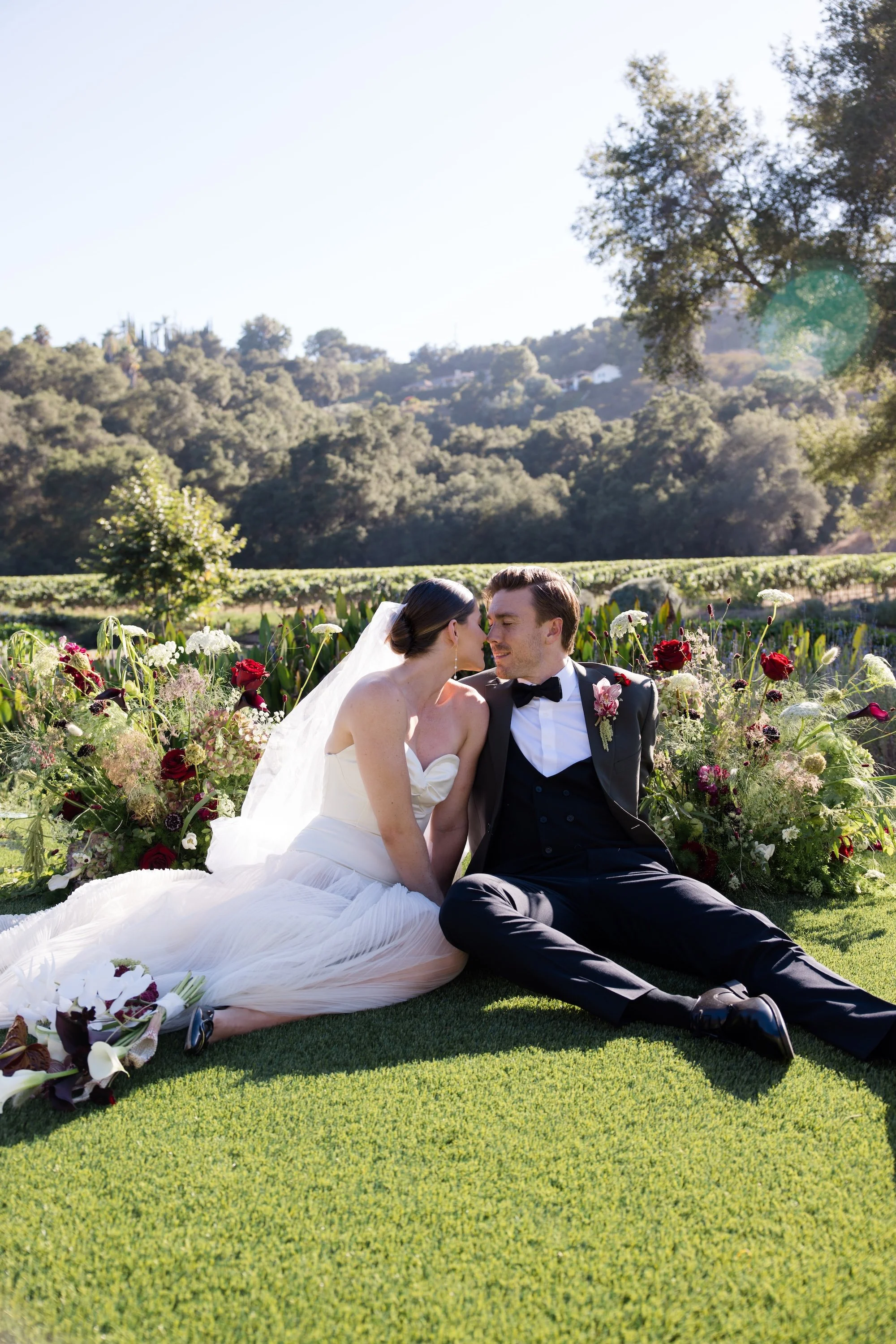 Ground arrangements bloom as if they emerged naturally from the earth, blending deep wine tones, airy whites, and lacy greens to create an atmosphere that is both romantic and grounded. The ceremony vignette frames the couple gently, allowing the scenery to remain the heart of the composition.