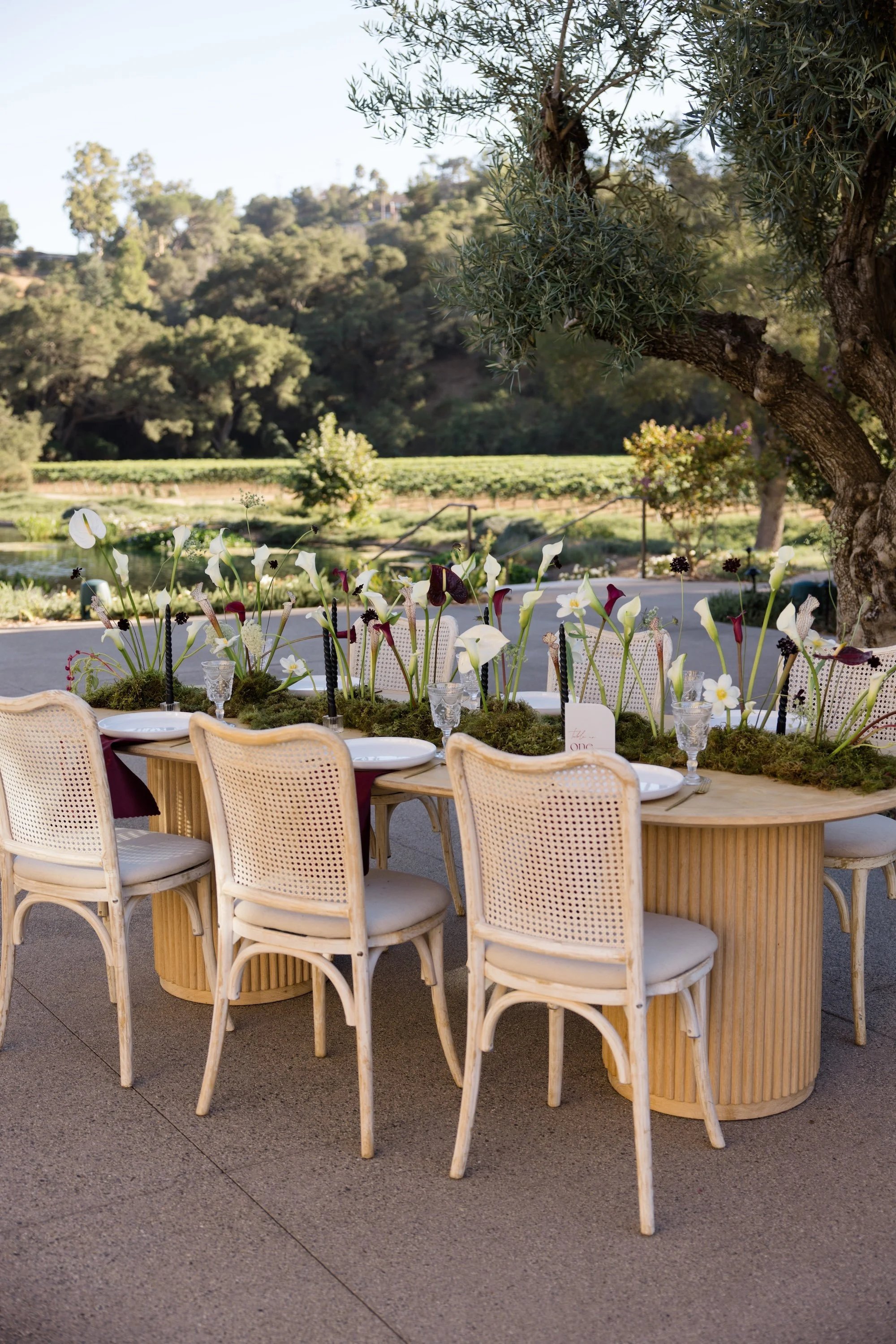 For the tablescape, minimalism meets natural artistry. Moss layers, sculptural calla lilies, and soft neutrals create a table that feels modern yet rooted—a quiet celebration of form, movement, and the textures that nature gives so freely.