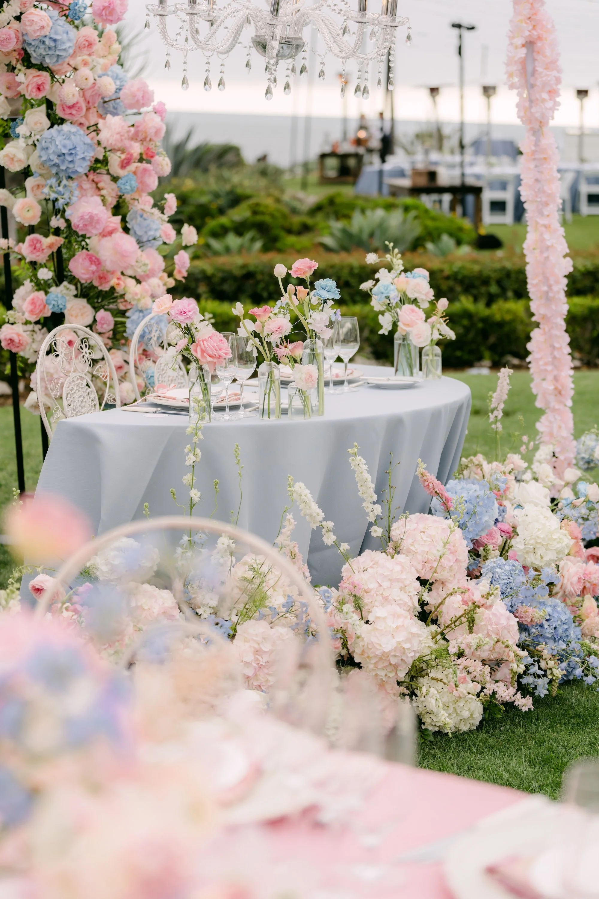 Along the aisle, low floral clouds continued the story, guiding guests through a pathway that felt light, inviting, and gently lifted by the sea breeze. The palette—featuring blush tones, airy blues, and delicate neutrals—enhanced the softness of the design, blending seamlessly into the bright coastal light.