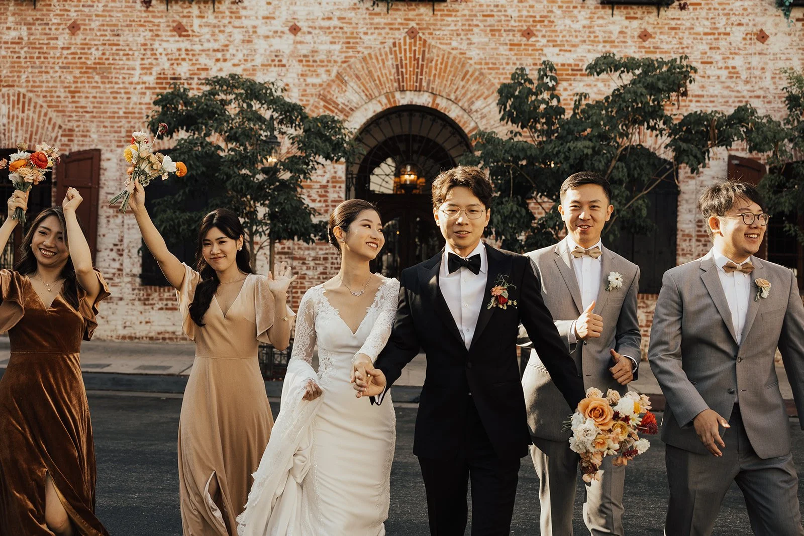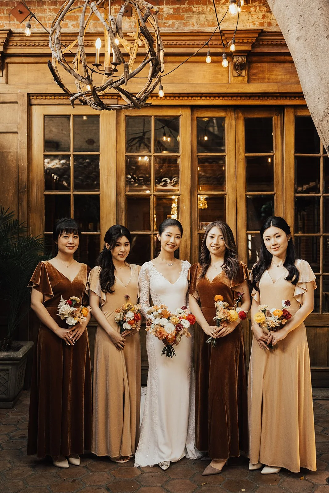 Set inside a historic brick-walled venue adorned with chandeliers and soft golden light, this wedding embraced a timeless kind of romance—warm, intimate, and effortlessly elegant. The floral palette blended antique golds, soft blush, dusty mauves, and deep wine tones, creating a lush, vintage-inspired atmosphere that felt both nostalgic and modern.
